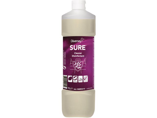 Ett säkert och miljömedvetet desinfektionsmedel för alla ytor där mat tillagas. SURE Disinfektionsmedel från Diversey är ett miljömedvetet och väldigt effektivt val. Lösningen är växtbaserad, 100 % biologiskt nedbrytbar och använder förnybara energikällor. Detta koncentrerade desinfektionsmedel är idealiskt för desinficering av alla ytor, t.ex. golv, bänkar, spisar och allmän utrustning. Det är idealiskt för användning där mat tillagas, för att döda bakterier och hålla platser sanitära. SURE-serien erbjuder professionella rengöringsprodukter som är utformade för att uppfylla kraven på effektivitet och tar även hänsyn till miljön och människors hälsa. Alla produkter är vegetabiliska och tillverkade av förnybara energikällor som är 100 % biologiskt nedbrytbara och utformade för effektivitet. - Högeffektivt miljövänligt rengöringsmedel och desinfektionsmedel - Tillverkad av 100 % biologiskt nedbrytbart material - Växtbaserat rengöringsmedel från förnybara källor - Desinficerar ytor såsom golv, bänkar, spisar och allmän utrustning - Dödar bakterier - Perfekt för användning där mat tillagas - Certifiering: EU Ecolabel - Etikettfärg: Lila - Volym: 1 l