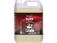 Ett säkert och miljövänligare rengöringsmedel som bryter ner kalkbeläggningar och effektivt rengör olika typer av golv och ytor. Koncentrerade SURE Washroom Cleaner and Descaler från Diversey är miljövänligare och så effektivt att det enkelt avlägsnar kalkbeläggningar och -avlagringar och tvålrester. Applicera medlet på ytan och torka bort det, så blir ytan skinande ren. Den maskinfärdiga lösningen kommer att fortsätta att förebygga framtida kalkbeläggningar och skumbildning, vilket gör underhåll och framtida rengöring mycket effektivare. SURE-serien erbjuder professionella rengöringsprodukter som är utformade för att uppfylla kraven på effektivitet och tar även hänsyn till miljön och människors hälsa. Alla produkter är vegetabiliska och tillverkade av förnybara energikällor som är 100 % nedbrytbara och utformade för effektivitet. - pH-värde: ca 2 (koncentrat) - Oparfymerad - Dosering: - Spraymetoden: Fyll avsedd 750ml sprayflaska med vatten och dosera 7,5 ml SURE Washroom & Descaler till flaskan. - Hinkmetoden: Dosera 50 ml (1%) till 5L vatten i en hink. Öka doseringen upp till 150 ml till 5L vatten (3%) vid mycket kalkavlagring. - Utseende: Färglös till gul vätska