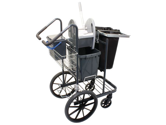 Fastighetsvagn som är extremt robust och tålig, anpassad för utomhusbruk. 400 mm bakhjul samt 150 mm framhjul. Vagnen är välbalanserad och lättmanövrerad vilket gör det enkelt att använda den utomhus. Komplett svabbutrustning. Tröskelklättrare. Extra stor tvättpåse. Handmanövrerad parkeringsbroms. Plats för 1 stativ. Krokar. - Mått (LxBxH): 985x560x1260mm - Svensktillverkad