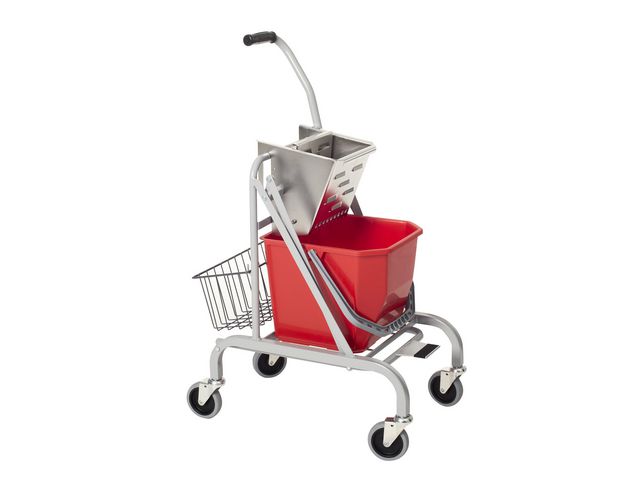 Den perfekta lilla svabbvagnen för svårstädade ytor. En liten svabbvagn med hand och fotpress 15 liters hink och rostfri press. Utrustad med 1 st korg. Låsbart hjul. - Rostfri press - Låsbart hjul - Liten - Mått: L 550 mm, B 400 mm, H 1070 mm - Tillverkad i Sverige