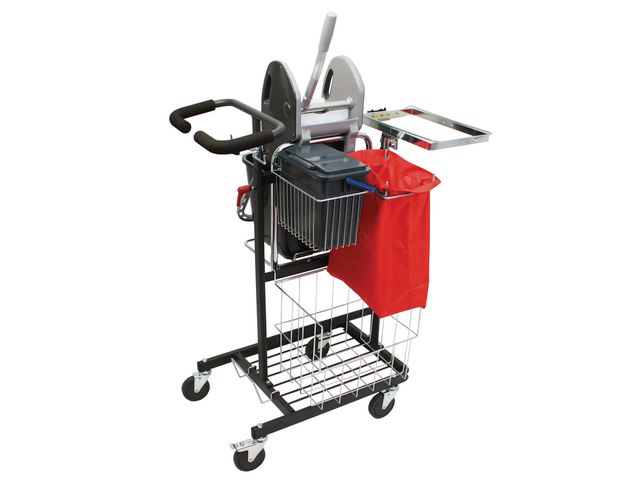 Liten och stabil. Enkel att montera. Komplett svabbutrustning. 6-litershink med flipplock. Liten tvättpåse. Extra stor materialkorg. Lättrullade 100 mm hjul. Plats för 2 stativ. Reglerbart handtag. Mått (LxBxH): 930x620x1260mm Svensktillverkad