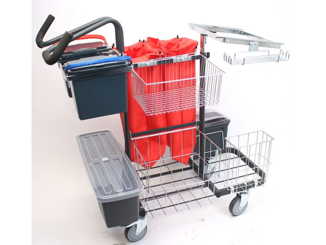 Städvagnen för dig som förpreparerar allt städmaterial i tvättmaskinen. Activa Metodvagn är en vagn med mycket generöst utrymme för material. Den har bl a, reglerbara handtag, dubbla tvättpåsar, två 6-liters hinkar, krokar mm. Perfekt för större städobjekt som skolor, sjukhus, stormarknader etc. På vagnen finns två färgkodade hinkar med flipplock, två mopplådor med lock samt två stora tvättpåsar. Säckhållaren för 125-literssäck är steglöst reglerbar i höjdled. Hjulen har ny design och håller en hög kvalitet. De är lätta att rengöra, rullar lätt och tyst. Handtaget är steglöst reglerbart i höjdled och utrustat med softgrip för ett mjukt och skönt grepp. - Innehåller: 2 st 6l hinkar m hållare, moppbox liten och stor m lock, tvättpåse m hållare, påshållare, trådkorgar, säckhållare mm. - Mått (LxBxH): 1155x680x1120 mm