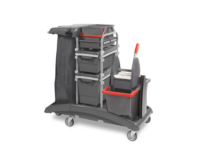 Med denna städvagn tar du städningen till en helt ny och högre nivå! EcoGreen Tray Press är en stor multiservicevagn anpassad för städning med svabb och utrustad med låsbara lådor för förvaring. Tillverkad i polypropen/stål. Förlängd basenhet i återvunnen PP-plast. Två vertikala stålramar med handtag och med integrerad 5 st hjul i Ø 125 mm var av ett med broms. Plastbricka för hinkar. 2 st 6 liter plasthink i återvunnen plast. 2 st 15 liter plasthinkar i återvunnen plast. 4 st lådskenor. 1 st 20 liter låda med dämpare. 1 st 30 liter låda med dämpare. 2 st täcklock med låsfunktion. 1 Svabbpress tillverkad av återvunnen plast, lämplig för moppar upp till 450 g, med handtagskrok. - Svabbpresshållare i 70% PP och 30% glasfiber - Säckhållare - 2 skafthållare - 4 krokar