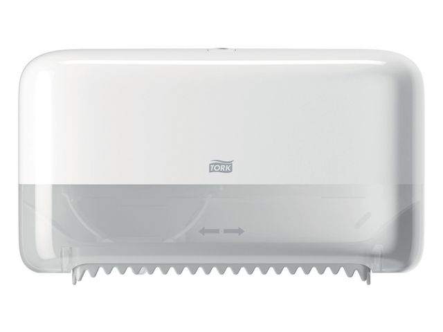 Tork Coreless Midsize Twin toalettpappersdispenser. Tork Dispenser Coreless Mid-size Twin Toalettpapper passar perfekt för toalettutrymmen med medelhög besöksfrekvens, där gästernas välbefinnande är extra viktigt. Den garanterar hög effektivitet och att toalettpapper alltid är tillgängligt för gästerna, eftersom den har plats för upp till nio gånger mer papper än två vanliga toalettpappersrullar. - System T7 - System Toalettpapper Mid-sizeTwin utan hylsa - Material: Plast - Höjd: 207 mm - Bredd: 360 mm - Djup: 130 mm - Färg: Vit