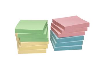 Självhäftande pastellfärgade noteringsblock gjorda av 100% återvunnet papper och vattenbaserat häftämne. 75x75mm. 100 blad/block. Blocken ligger löst förpackade i en pappersask, som även den är tillverkad av 100% återvunnet material. Produkten är Blue Angel certifierad. 12 block/fp.