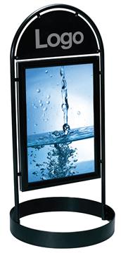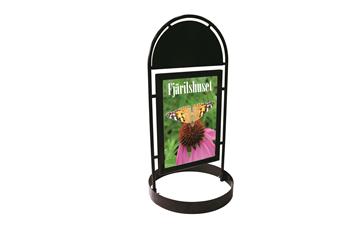 Gatuställ Gotik-City m rund fot. Tillverkad av 25mm polyesterlackerade stålrör. Halvmåneformad logo-platta. Skyltplatta 50x70 cm med dubbla snäppramar i 32mm aluminium. Frontplast i PET antireflexplast. Ett gatuställ som ofta föreskrivs i citymiljöer då det underlättar för synskadade.